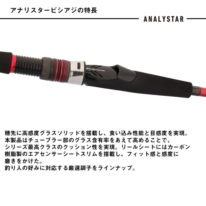 穂先に高感度グラスソリッドを搭載し、食い込み性能と目感度を実現。チューブラー部のグラス含有率をあえて高めることで、シリーズ最高クラスのクッション性を実現。リールシートにはカーボン樹脂製のエアセンサーシートスリムを搭載し、フィット感と感度に磨きをかけた。釣り人の好みに対応する厳選調子をラインナップ。[ANALYSTAR BISHI-AJI][26new01]