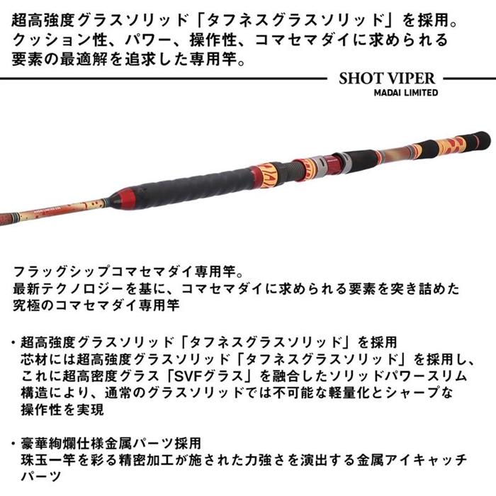 ダイワコマセマダイ史上、最高クラスのクッション性とパワーを追求。芯材には超高強度グラスソリッド「タフネスグラスソリッド」を採用し、これに超高密度グラス「SVFグラス」を融合したソリッドパワースリム構造により、通常のグラスソリッドでは不可能な軽量化とシャープな操作性を実現。更に、コマセワークや、合わせ等パワーが必要となるセクションには低弾性カーボン採用し、芯のあるしなやかさを体現。そして、各セクションのバランスを一新することで、置き竿での仕掛け安定力、ファイト中の魚のコントロール性能を飛躍的に向上させた。ガイド配置、サイズといった細部にも手を加え、幾重ものカーボン、グラスを混合させ、あらゆる要素の最適解を体現したダイワコマセマダイ竿のフラッグシップモデル。[SHOT VIPER MADAI LIMITED][26new01]