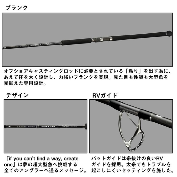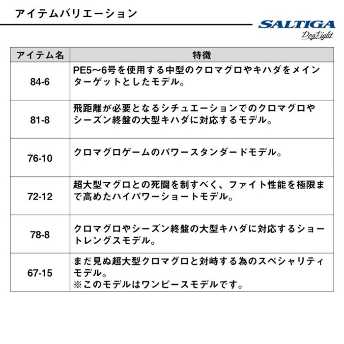 佐藤偉知郎のマグロ理論を具現化した最新鋭のマグロキャスティングロッド。DOGFIGHT(意味:単独の格闘戦)を冠するこのロッドは、その名の通り、シングルファイトを前提とした設計を施しており、拘り抜いたブランクは、佐藤偉知郎のファイトスタイルである『曲げて捕る』をしなやかなテーパーと強靭な復元力で実現。さらに、佐藤偉知郎のノウハウとダイワテクノロジーを融合させることにより、近代マグロゲームで必要とされる飛距離性能を底上げした。BREAK YOUR RECORD このロッドで記憶に残る1本を手にして欲しい。[SALTIGA C DOGFIGHT][26new01]
