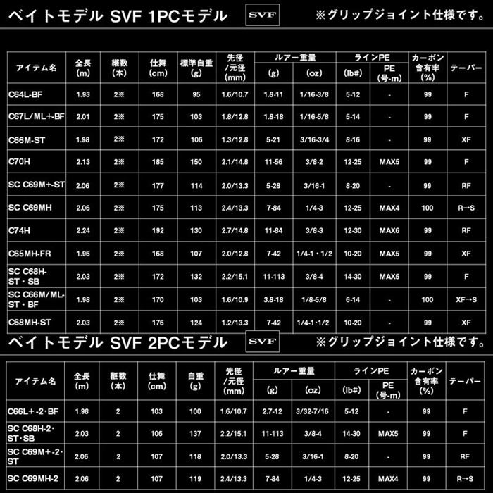 現代のタフ化が進むフィールドで釣り勝つべく、ビッグベイト・スイムベイトの実釣性能を最大限引き出したショアコンペティション(SC)のSB(スイムベイト・ビッグベイト)ロッド。STEEZ SC ストラトフォートレス68をベースにユーザビリティーの向上を目指したアイテム。ビッグベイト・スイムベイトの遠投性能、近距離を高精度に撃ち込むピッチング性能、バイトに持ち込むために水中のルアーを水に絡ませた艶めかしいアクションを繊細かつ正確に演出させる操作性、そして水中のルアーの状態をアングラー側に伝える感度、突発的なバイトも弾かずしっかり絡めながらも太軸フックを貫通させるバットパワー、強さの中に安心して魚とファイト出来る適度なしなやかさ。これら相反する要素を絶妙なバランスで一本に纏め上げた、ストラトフォートレス68をベースにステンレスフレームガイドをセッティング。耐久性が増すだけでなく、ガイドの重みで竿がしなってくれるおかげで投げやすくなっており、スローなスウィングでもルアーを弾き飛ばしてくれ、遠投性能やオーバーハングの奥の奥までルアーを運んでくれる。ティップをスティッフにすることで近距離のピッチング性能を向上させた一方で、硬い高弾性ソリッドティップの先端に「『へ』の字テーパー」を施すことにより手感度とリニアな操作性、さらにビッグベイトのノリの良さを大幅に向上。チューブラーは中弾性カーボンを採用することで硬さの中にもしなやかさを持たせつつ、バットを3DXでアシストする事で、遠投性能を引き出した。1PCモデルの性能を維持したまま、携行性を高めつつもVジョイントを搭載することで、通常のセンターカット2PCSに比べ、パワー・レスポンス・感度が向上したハイレベルなセンターカット2PCS。
