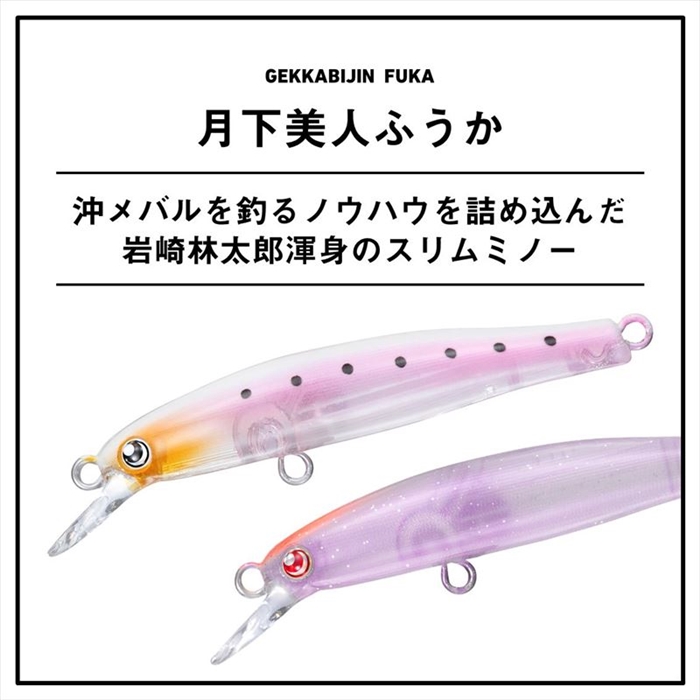 岩崎林太郎監修。マグネット重心移動を搭載し、安定した飛距離を確立。重心移動の距離も煮詰め、着水からすぐにアクションへ移行できるように調整。着水後すぐにアクション出来るレスポンスの高さを実現した。また、移動重心ウエイトは磁着時にあえてボディの真ん中へ収まる様に設定。スローリトリーブでしっかりアクションしつつも、突然ふらっとアクションが破綻するように調整した。一定のアクションでは見切ってしまうメバルに対しニュートラルにバイトスイッチを入れることが可能となっている。55Fは水深1mより浅いレンジを得意とし、55Sはフローティングに比べて遠投性能が高く沖のメバルやレンジが深い場合に有効。アイテムごとに異なるアイカラーを採用。(Fモデル:白/Sモデル:赤)[GEKKABIJIN FUKA][24new16]