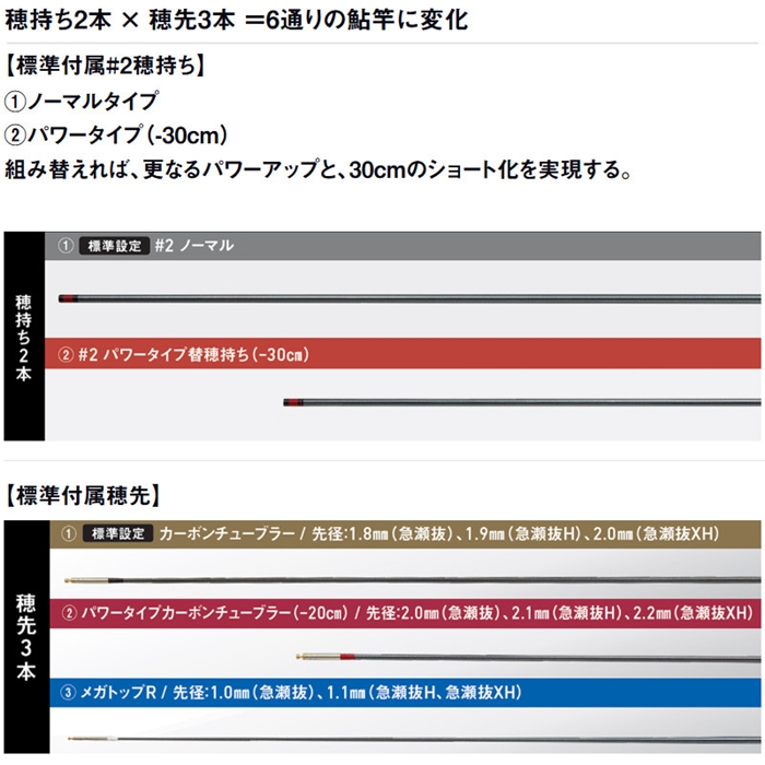 瀬釣り、大鮎用胴調子のメガトルクが一新。新たに7本継の長節設計を採用することで、前作以上にスムーズに竿全体が曲がりこむ調子となり、抜群の引き性能とタメ性能を獲得した『8代目メガトルク』。今回はアイテム構成を見直し4種がラインナップ。歴代メガトルク史上最も引きやすく強い「急瀬抜90」。前作には無かった、より軽快な瀬釣りと風対策等にベストマッチな「急瀬抜85」。前作より長いレングスで掛ければ強靭なタメ性能で24cmから27cmクラスを手返し良く引き抜くパワーを発揮する「急瀬抜H90」。パワーを連想させない程の軽量感ながら、圧倒的パワーで大鮎・尺鮎を流心から引きずり出す「急瀬抜XH90」。ノサれず1歩も下らずに獲る獰猛さに加え、Aに迫るほどの繊細な引き性能であらゆるシーンに対応する、パワーオールラウンダーが誕生した。[26new01][GINEI KYOGI MEGATORQE]