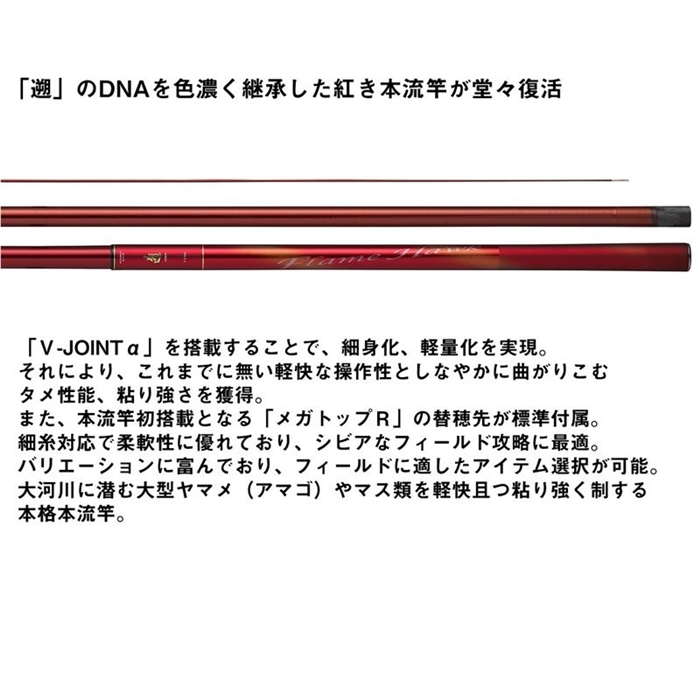 「遡」のDNAを色濃く継承した紅き本流竿が堂々復活。遡フレイムホーク史上初の「V-JOINTα」を搭載することで、強靭なパワーと粘りを備えながら、細身化、軽量化を実現。また、本流竿初搭載となる「メガトップR」の替穂先が標準付属。柔軟性に優れ、細糸に対応し、低活性時やスレた状況に最適。アイテムバリエーションに富んでおり、フィールドに適したアイテム選択が可能。大河川に潜む大型ヤマメ(アマゴ)やマス類を軽快且つパワフルに制する本格本流竿。[26new01][NOBORI FLAME HAWK]