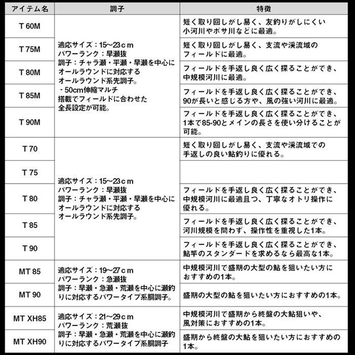 更なる軽量化を実現した価格破壊の革命児「アバンサー」。フィールドを問わず幅広く使えるオールラウンド先調子モデルの『T』に、オモリを駆使した瀬釣りや25cmオーバーの良型を狙うのに最適なパワータイプ胴調子モデルの『MT』を展開。新たに、支流攻略や風対策に最適な「T 75」と、尺鮎をも捻じ伏せるパワーの「MT XH90」と「MT XH85」をラインナップ。「T 75」は、ノンマルチで軽快且つ、小河川や支流を中心に幅広く使えるオールラウンド先調子モデル。「MT XH90」と「MT XH85」は、25cmオーバーから尺クラスの大鮎を狙うのに最適なパワータイプ胴調子モデル。スタンダードなノンマルチタイプに加え、1本で2通りの長さが使えるマルチタイプの全14アイテムのワイドバリエーションで、釣法やフィールドに合わせて最適なセレクトが可能。パワータイプカーボンチューブラー標準替穂先(-20cm)を標準装備したことで、瀬釣り、更なる大型にも幅広く対応。価格以上のスペックで、初心者から上級者まで、鮎釣りを存分に楽しめる一竿。[AVANCER][26new01]