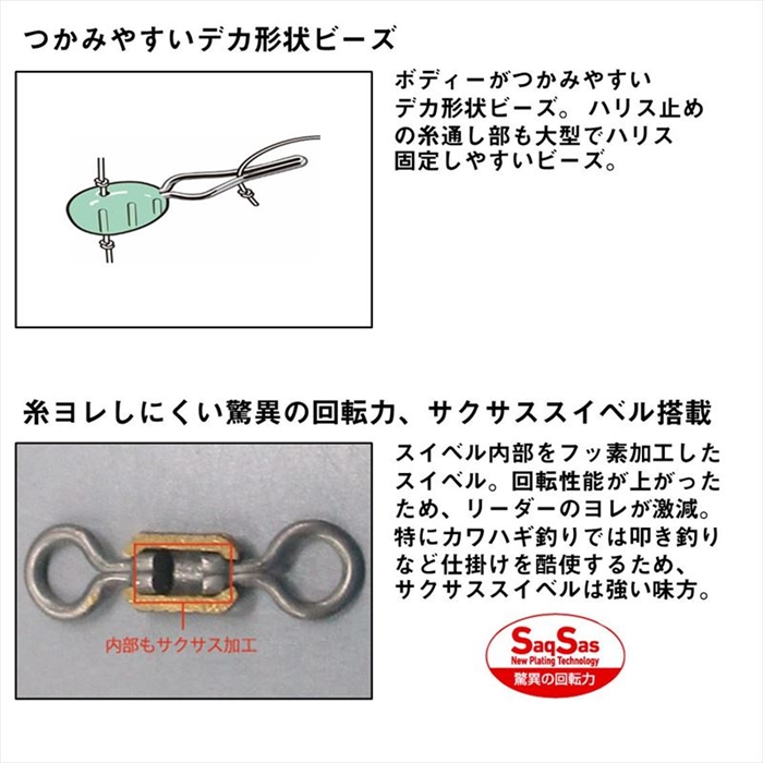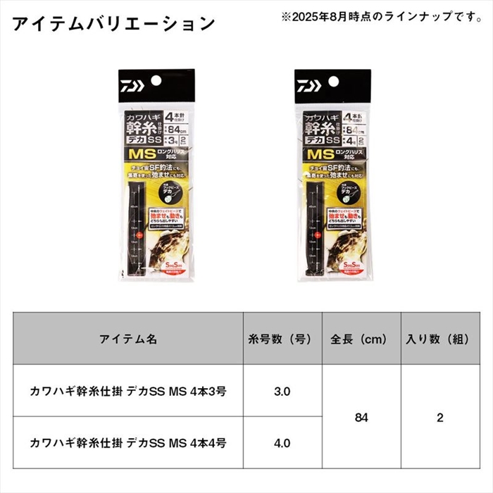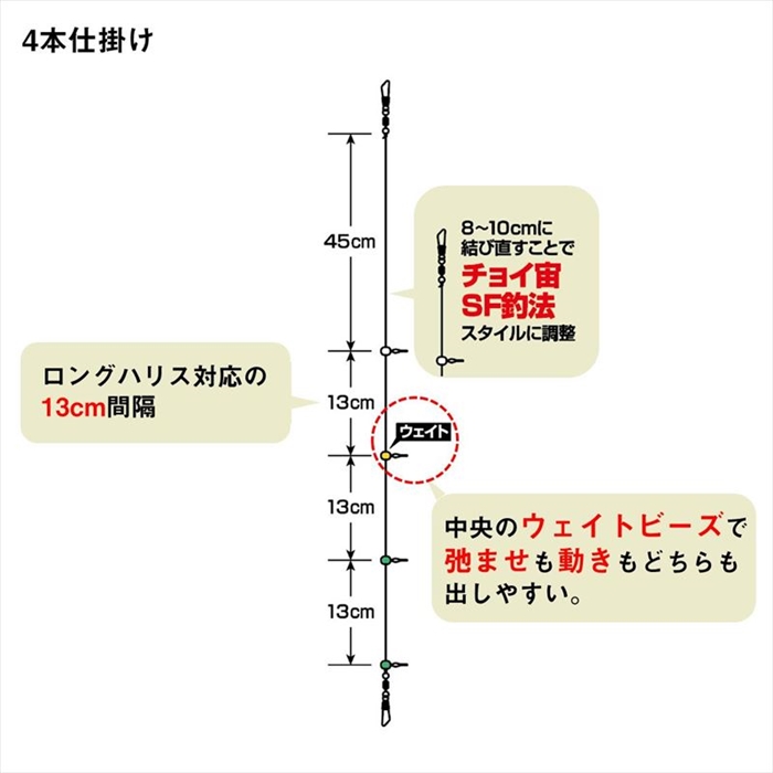 4本仕掛となっており、宮澤テスターの代名詞とも言えるチョイ宙 SF釣法から集寄を使用した弛ませの釣りまで、様々なシチュエーションで使いこなす事ができる幹糸仕掛。また仕掛けの中央部に鉛製フックビーズを入れることで、弛ませもエサの動きも出しやすくなる。ロングハリスも対応の針間設定となっている。[KAWAHAGI MIKISHIKAKE DEKA SS MS]