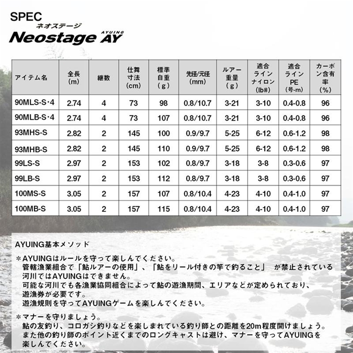 「Neostage AY」鮎をルアーで釣る新メソッド、アユイング用に開発された専用ロッド。より広範囲にドリフトさせ、もう一筋先の流れをトレース可能なロングレングスモデルもラインナップ。横の攻めは勿論、急流でジョイントバイブを使った縦の攻めも容易にこなし、アユイングの世界を拡大させる。[NEOSTAGE AY][26new01]