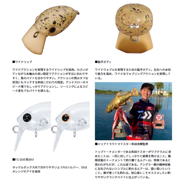 トーナメントの最前線で戦う和田浩輝監修の小型クランク。小さいボディながら水噛みの良い設定でアクションが手元に伝わりやすく、魚のバイトも分かりやすい。デッドスローのスピード域でもしっかりアクションし、リーリングによるスピード変化でもバイトを誘える。ボディ内部にはラトルを内蔵。音質にもこだわり、アングラー側から仕掛けて魚にスイッチを入れられるルアーに仕上がっている。フローティング(F)モデルは、表層レンジにいる活性の良い魚に、浮力を活かしたキビキビアクションで、積極的に魚のスイッチを入れていく。スローシンキング(SS)モデルは、表層レンジにいる活性の落ちたスローな魚に、スピードを合わせて釣っていく食わせのアクション。 それぞれの役割を理解することで釣れる魚が増大する。[PRESSO WABCRA Jr.]