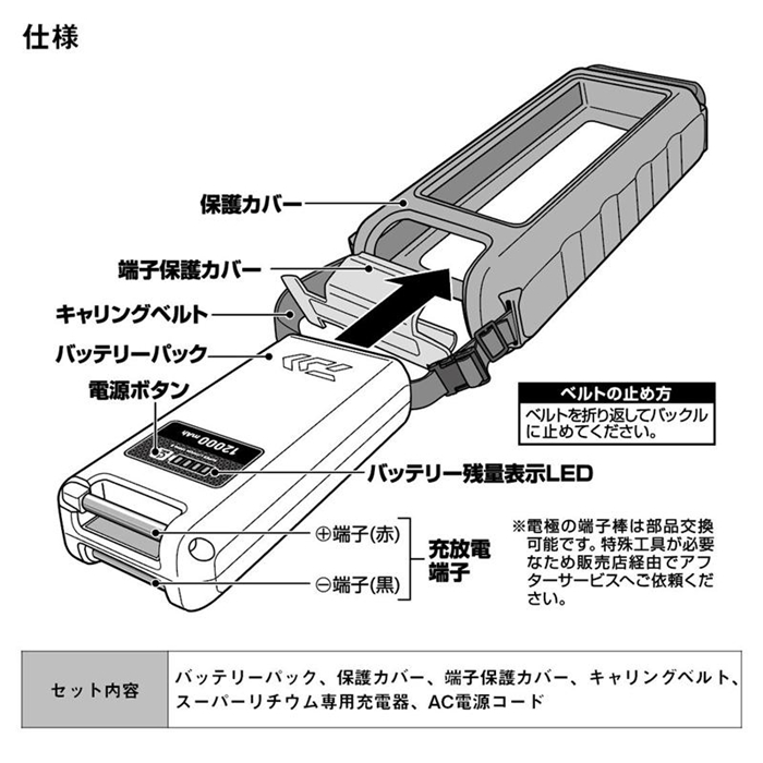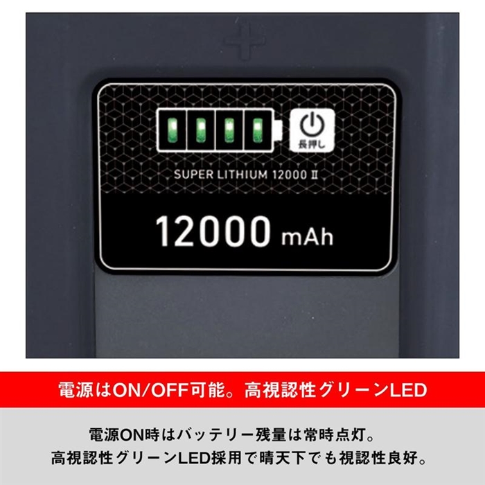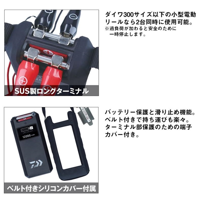 鉛バッテリーに比べて巻き上げスピードとパワーがアップ。使いやすい電源ON/OFFスイッチを装備。常時点灯する高視認性グリーンLED採用で、晴天下でも残量が確認しやすい。過負荷が加わると安全のために一時停止するセーフティ機能付き。ダイワ電動リール1800サイズ以下全アイテムに対応(マリンパワー・ワカサギ電動除く)。ダイワ300サイズ以下の小型電動リールなら2台同時使用可能なSUS製ロングターミナル(充放電端子)を採用。衝撃を吸収し、船ベリに置いた時の滑り止めにもなるシリコンカバー付き。持ち運びに便利なキャリングベルト付き。ターミナル部はアフターサービスにて交換可能。充電器は専用の「SUPER LITHIUM CHARGER 1800 II」のみ対応。メンテナンスが簡単なウォッシャブル設計(※水没や洗剤での洗浄は不可)。[SUPER LITHIUM 12000WP2-C][26new02]