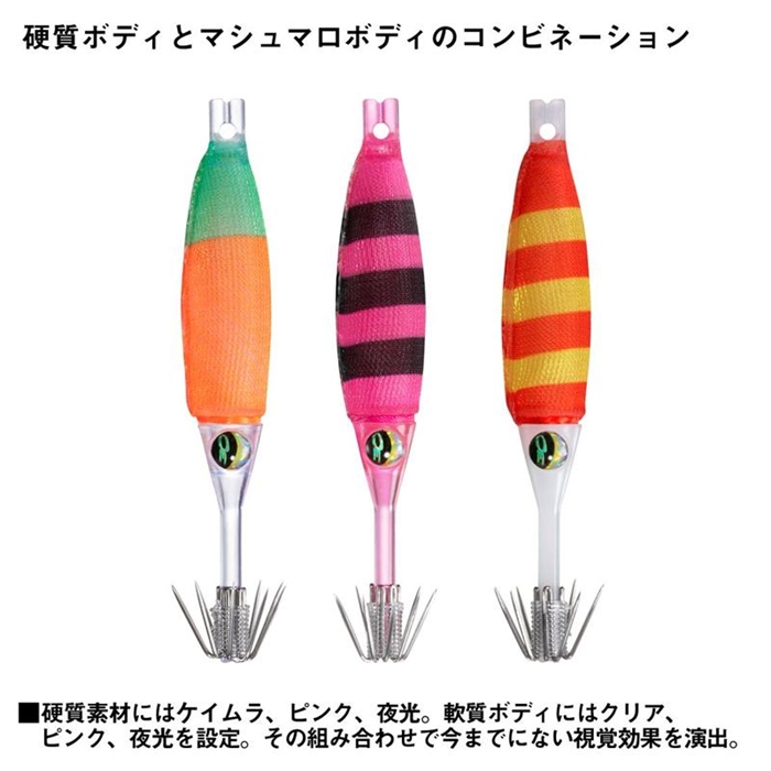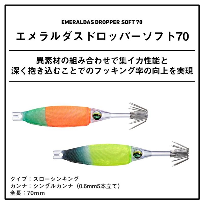 硬質素材のボディーの輝きと軟質素材のボディーの組み合わせで、集イカ性能と深く抱き込むことでのフッキング率の向上を実現した新感覚ドロッパー。絶妙な浮力と発光ボディで、イカを誘いバイトに持ち込む。バイトしてからはマシュマロボディのベイトフィッシュライクな触感で、より深く抱き込みフッキングチャンスを増やす。強度と刺さりの良さを両立した日本製素材のスーパーシャープフックにより、フッキング率が向上。[EMERALDAS DROPPER SOFT]
