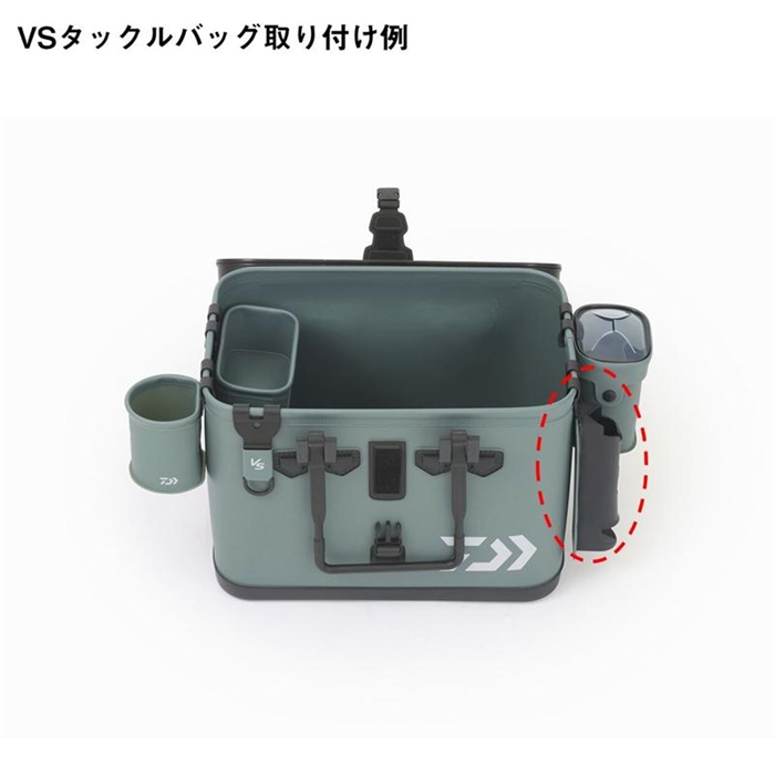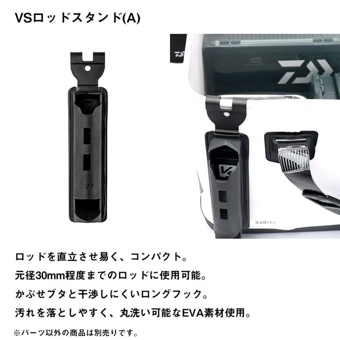 多くのEVA製タックルバッグに取り付け可能なオプションパーツです。タックルバッグのかぶせブタと干渉しにくいロングフックが特徴で、汚れを落としやすく丸洗い可能なEVA素材を使用。また、元径30mm程度までのロッドにも対応しています。[VS ROD STAND(A)]