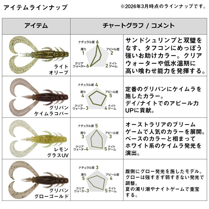 全国でブームを引き起こしている、フリーリグスタイルのチニングゲームの第一人者、森テスター(通称:もりぞー)が監修の専用ワーム。ショートバイトが多い釣りであるため、フックアップに持ち込むことができるようなアイデアを随所に盛り込んでいる。また、ダイワ社独自のテクノロジー「アミノX」とエビ粉をボディ素材に配合。集魚成分もフッキングに持ち込む強いバイトを引き出すための重要な役割を果たしている。[SILVER WOLF URBAN CRAWLER][26new16]