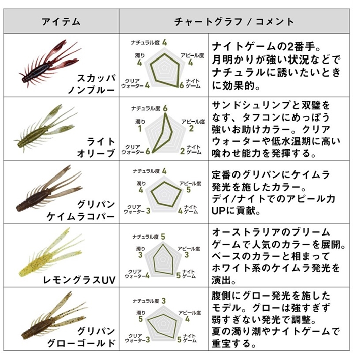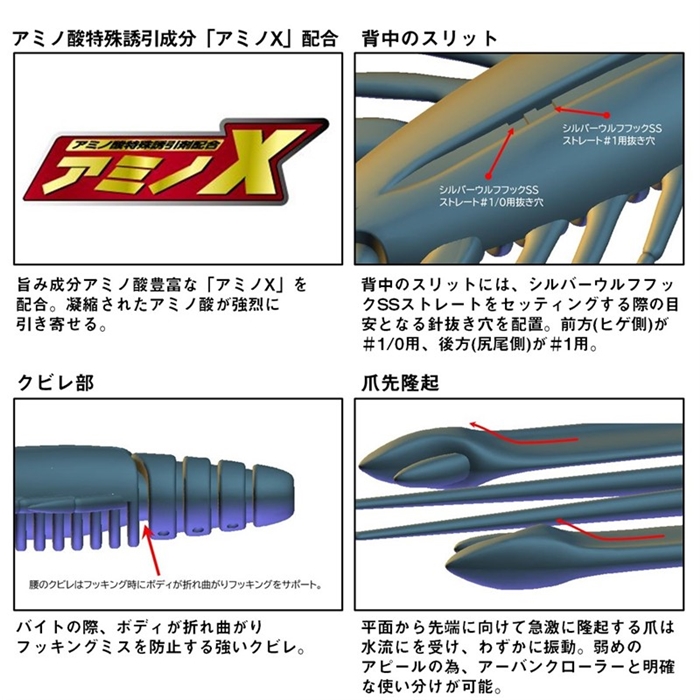 全国でブームを引き起こしている、フリーリグチニングゲームの第一人者、森浩平テスター(通称:もりぞー)監修ワームの第2弾。第1弾として発売したアーバンクローラー2.5が巻きの釣りに特化していたのに対し、アーバンシュリンプは、「ボトムバンプ」や「ズル引き&ステイ」など、低活性時のスローな展開に有効。強い波動を嫌うセンシティブな状況に対応する微波動系ワーム。2.4inchは、単に2.8inchのダウンサイズではなく、サイドレッグの数を増やすとともに、ツメのボリュームを上げることで、アピール力はキープしつつシルエットサイズを下げ食い渋りに対応。河口域など広大なエリアでもチヌにアピールする力を維持しながらも、タフコンディション時にバイトに至らせることのできるハイアピールスモールベイト。また、ダイワ社独自のテクノロジー「アミノX」とエビ粉をボディ素材に配合。集魚成分もフッキングに持ち込む強いバイトを引き出すための重要な役割を果たしている。[SILVER WOLF URBAN SHRIMP][26new16]