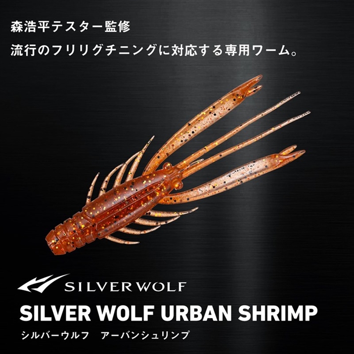 全国でブームを引き起こしている、フリーリグチニングゲームの第一人者、森浩平テスター(通称:もりぞー)監修ワームの第2弾。第1弾として発売したアーバンクローラー2.5が巻きの釣りに特化していたのに対し、アーバンシュリンプは、「ボトムバンプ」や「ズル引き&ステイ」など、低活性時のスローな展開に有効。強い波動を嫌うセンシティブな状況に対応する微波動系ワーム。2.4inchは、単に2.8inchのダウンサイズではなく、サイドレッグの数を増やすとともに、ツメのボリュームを上げることで、アピール力はキープしつつシルエットサイズを下げ食い渋りに対応。河口域など広大なエリアでもチヌにアピールする力を維持しながらも、タフコンディション時にバイトに至らせることのできるハイアピールスモールベイト。また、ダイワ社独自のテクノロジー「アミノX」とエビ粉をボディ素材に配合。集魚成分もフッキングに持ち込む強いバイトを引き出すための重要な役割を果たしている。[SILVER WOLF URBAN SHRIMP][26new16]