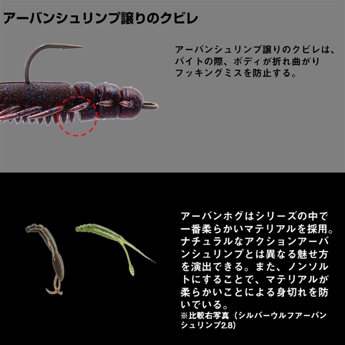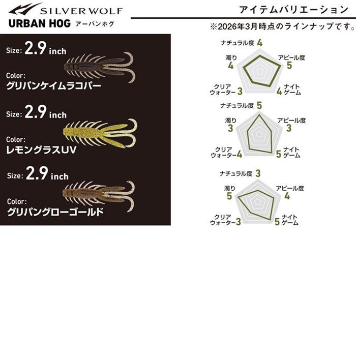 全国でブームを引き起こしている、フリリグチニングゲームの第一人者、森浩平テスター(通称:もりぞー)監修ワームの第3弾。低活性字のスローな展開を得意とするアーバンシュリンプに対し、アーバンホグは、よりボリュームが欲しい春の時期やアピールは最小限にテンポよく釣りを行う展開に有効。ナチュラルな水押しと存在感でアピールする。爪の形もチニング専用設計。爪をウチワ形にせず、後端を絞ったデザインを採用。ボリュームは確保しつつ空位抵抗を減らすことで飛距離と操作性が向上し、ホグ独特の飛距離不足や操作感のダルさを解消している。[SILVER WOLF URBAN HOG][26new16]
