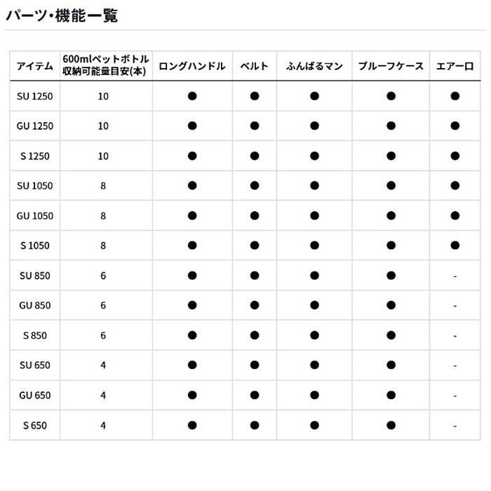 用途に合わせて選べる12.5L、10.5L、8.5L、6.5Lの4サイズ、各6色展開。高保冷の真空パネル仕様、ウレタン仕様、軽量スチロール仕様の3グレード。サンドイッチやオニギリを濡らさず収納できるプルーフケース付き。ペットボトル600mlが縦置き収納可能。12.5Lは最大10本、10.5Lは最大8本、8.5Lは最大6本、6.5Lは最大4本(6.5Lは横置き)。自転車の前カゴに入れやすいサイズ設計(8.5L、6.5L)。別売では、プルーフケースPC-0810、CPアイスも収納可能。[MINI COOL II][26new03]