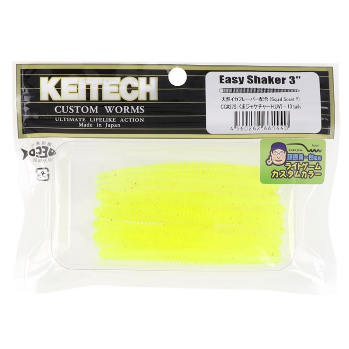 【ケイテック/KEITECH】(藤原真一郎監修 ライトゲームカスタムカラー)コアは細身ながらリングをまとうことで、シルエットにボリュームを持たせつつ生命体ならではの自然な動き=「Ultimate Lifelike Action」を実現した『イージーシェイカー』。リングボディ+ノンソルティマテリアルの組み合わせにより、ジグヘッドリグのスイミング時、あるいはダウンショットリグでボトムから浮かせた状態で誘った時など、絶妙な姿勢に加えて、トリッキーなダートやもだえるような艶めかしいアクションがその名のとおり「イージー」に演出可能となっています。近年はバスフィッシングのみならず、アジングやロックフィッシュゲームをはじめソルトウォーターの世界でもその効能が認められており、ケイテック社ラインナップのなかにあって「釣れるルアーは魚種を選ばない」を地で行く製品のひとつ。バスで言うところのウルトラフィネスからオーソドックスなライトリグ仕様まで、ラインナップを拡充してまいりました。フィールドコンディションや対象魚にあわせた、最適なサイズをお選びください。[Easy Shaker]