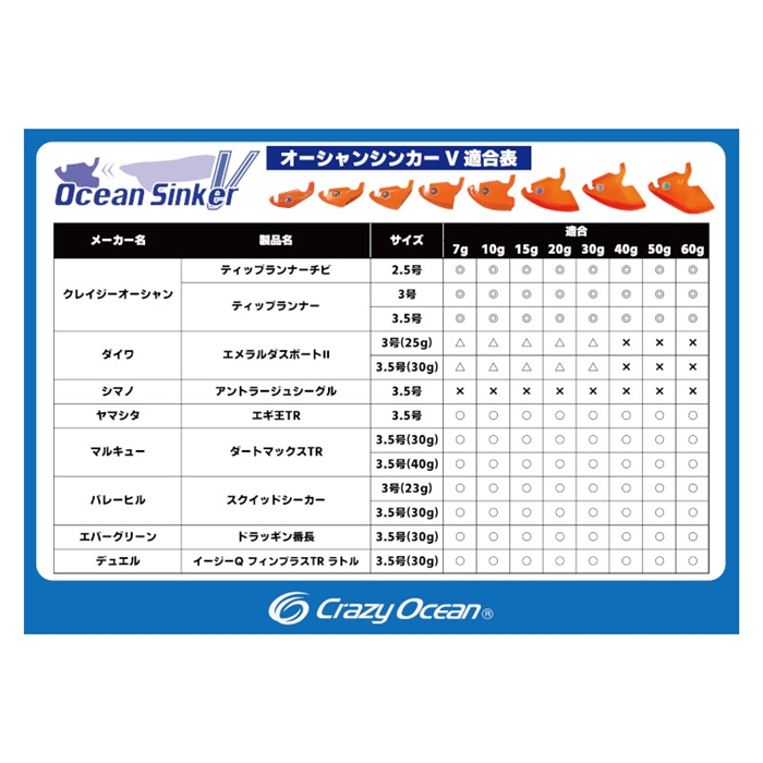 【クレイジーオーシャン/Crazy Ocean】強風や深場などハードコンディション下におけるティップランエギングで、ノーマルセッティングでは攻略できない状況を打破する為の必須アイテム!各種メーカーのティップランエギに幅広く装着可能。装着時にエギの姿勢を崩さないウェイトバランス設計(ティップランナー装着時)お試し!シンカーストッパーバンド付き[Ocean Sinker V]