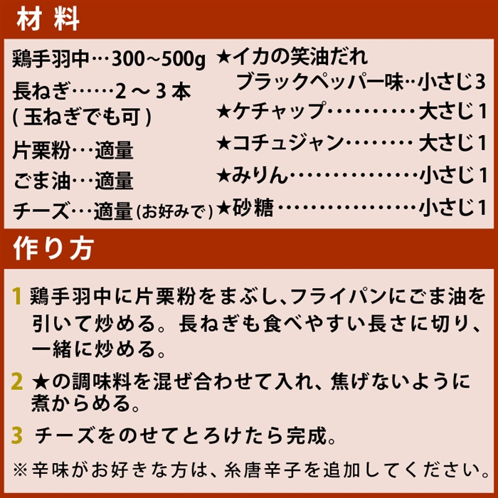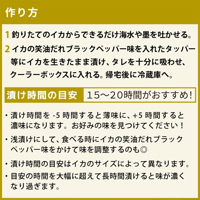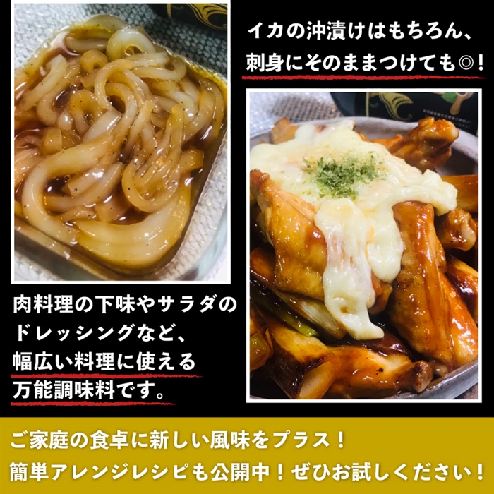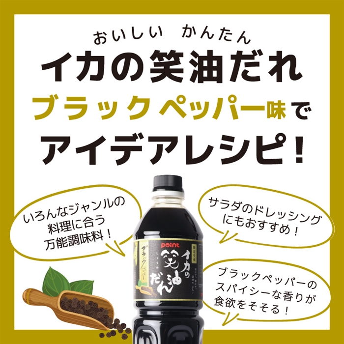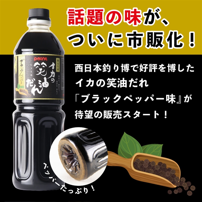 話題の味が、ついに市販化!西日本釣り博で好評を博したイカの笑油だれ『ブラックペッパー味』が待望の販売スタート!ブラックペッパーのスパイシーな香りが食欲をそそります。イカの沖漬けはもちろん、刺身にそのままつけても◎!肉料理の下味やサラダのドレッシングなど、幅広い料理に使える万能調味料です。[刺身 醤油 さしみ しょうゆ]