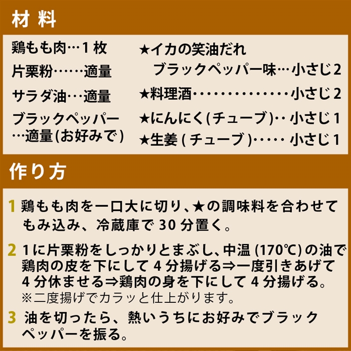 【原材料名】 米発酵調味料(国内製造)、しょうゆ(小麦を含む)、糖類(砂糖混合ぶどう糖果糖液糖、水飴)、アミノ酸液(大豆を含む)、食塩、おろしにんにく、ブラックペッパー / 調味料(アミノ酸等)、カラメル色素、甘味料(ステビア、甘草)、ビタミンB1