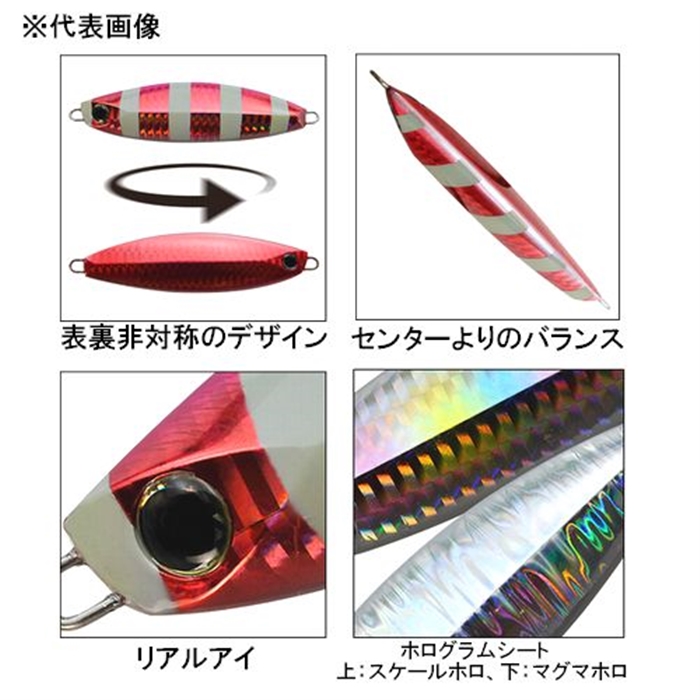このモデルが目指したのは、極めて短い移動距離でも、確実に水平姿勢を生みだすこと。さらに、ターゲットに対して横方向にボディを見せる時間を極力長くとることにあります。そのためウエイトバランスはテーリングの起きにくい限界を追求。結果としてほぼセンターにバランスを持つボディが完成しました。フォール時は横姿勢となることで、やや遅めのスピードとなり、じっくりとターゲットにアピールします。ボディの厚肉面と薄肉面を織り交ぜたイレギュラーフォールによるフラッシングが大きな特徴です。
