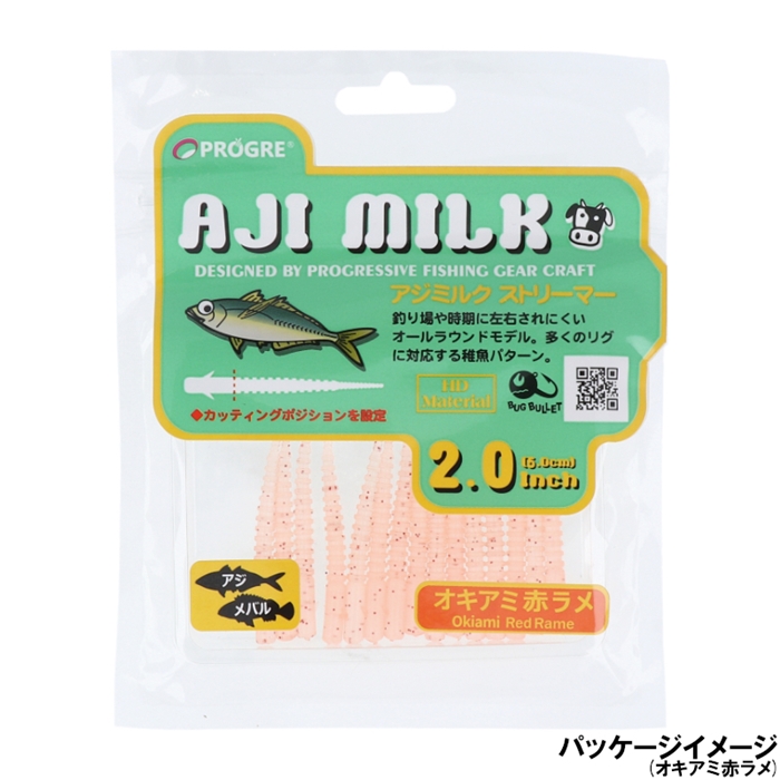 【プログレ/PROGRE】スモールベイトパターン。小-中アジ対応の稚魚パターン。釣り場や時期に左右されにくくリグを選ばないオールラウンドモデル。4種の中で最も体積が小さいため、吸い込みやすく小型のアジにも対応。表面積が大きいため2.5inモデルに比較し沈下速度が比較的遅めのため日中極小ジグヘッドでゆっくり食わせるのにも最適。[AJI MILK STREAMER]