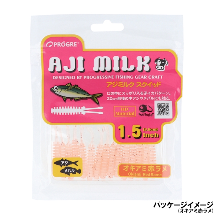 【プログレ/PROGRE】ベビーイカパターン。口の中にスッポリ入りやすいよう無駄な肉をそぎ落としたモデル。全体に深リブに設計することで見た目の太いシルエットより小さな体積にすることでジグヘッドのゲイブを十分に生かし魚の口への「浅掛かり」を防止。小-中アジから20cm前後のメバルやカマスにも対応。[AJI MILK SQUID15]
