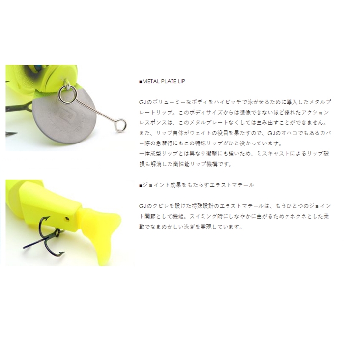 【レイドジャパン/RAID JAPAN】G.I(GRAVITY IMPACT)は、最小限のタックルで釣行したい高機動アングラーのために、リップ付きビッグベイトをMHクラスのロッドで扱えるサイズに落とし込んだお手頃サイズのコンパクトジョイントベイト。魚を惹き寄せるインパクトはビッグベイトさながらに、汎用性の高いいつものMHクラスのタックルで扱えるG.I.は、あなたの攻めの幅を広げる新たな一手となるでしょう。※ブリスターにスペアテール付属