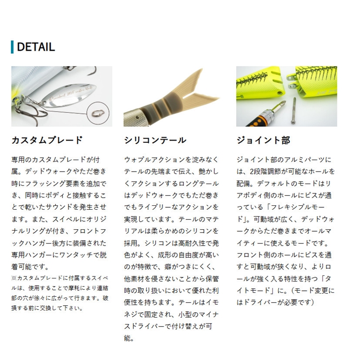 【グラスルーツ/GRASS ROOTS】2ピースジョイントボディに艶かしく動くシリコン製ロングテールを組み合わせた全長210mmスイムベイト。スキニーシェイプが存在感と喰わせ能力を両立し、3フック仕様が大型スイムベイトに頻発するキスバイトや浅掛かりによるバレを抑制します(フロントフックにはローリングスイベル採用)。ジョイント部は可動域が広いフレキシブルモードと、可動域が狭いタイトモードにモードチェンジ可能。更に、リップレス、ショートリップ、ダイビングリップが選択でき、トップウォーターからミドルレンジ(約3m)まで、パーツをカスタマイズすることで幅広いアプローチが可能なスイムベイトに仕上がっています。[RUNABOUT 210F]