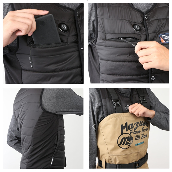 【オレンジブルー/ORANGE and BLUE】mazumeのヒーターベストは釣り専用!!右胸の釣りの動作に干渉しづらい位置にバッテリーポケットとスイッチを配置。インフレータブル装着時やウェーダー着用時にスイッチが誤作動しないようになっています。バッテリーポケットの内側は丈夫なオックスフォード生地を使用しており、胸ポケットに入れた重たいバッテリーが生地を引っ張りずり下がるのを防ぎます。アームホールはタイトに設計し、キャストやしゃくりの動作に生地が干渉しません。