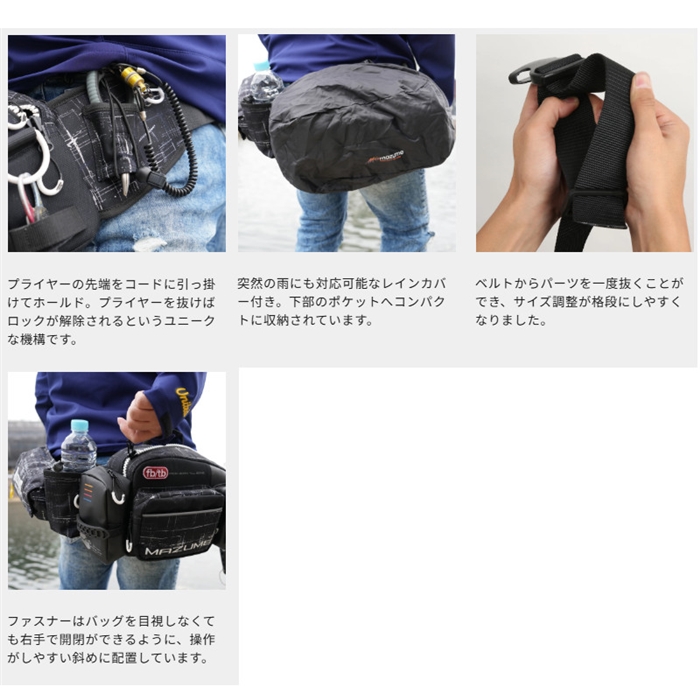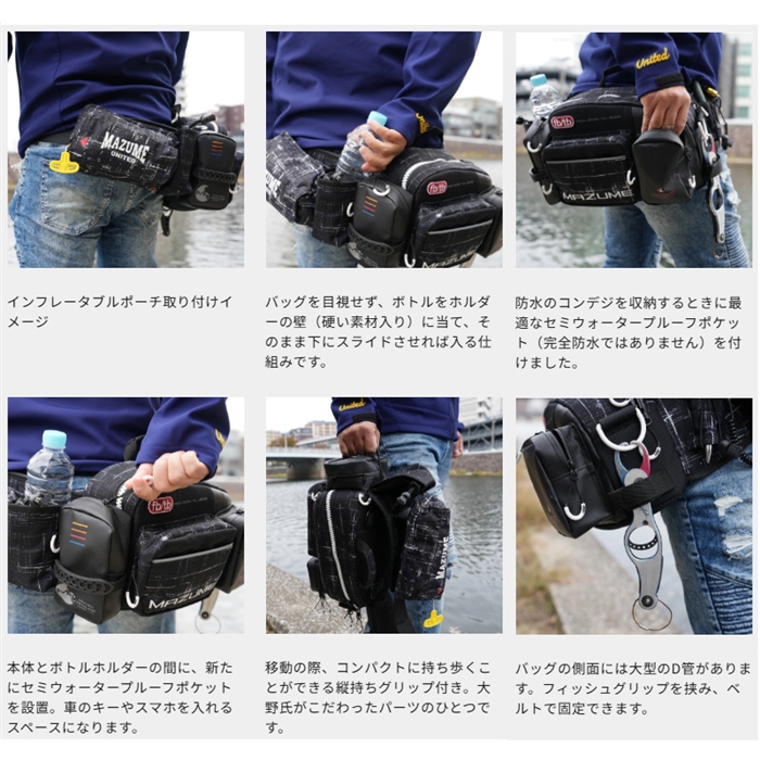 【オレンジブルー/ORANGE and BLUE】実釣から生まれる「機能する数々の意匠」大野ゆうきの一言から生まれた湾岸スタイル定番バッグ。大野ゆうきのアーバンサイドスタイルの中核を成すレッドムーンウエストバッグのNEWモデル!必須機能はそのままに、新たな機能とデザインを一新!バックで釣果を変える!!メインファスナーはバッグが腰側にある状態での使用を想定し 、バッグを手前に回さなくても片手で開閉できるように斜めに配置されています。ボディは芯材を何層にも重ね、ハードケースのように強化!型崩れを防ぐだけでなく、スムーズなファスナーの開閉に一役買っています。NEWモデルでは2ヶ所のターポリンポーチを裏側までターポリン素材にすることで防水性能を強化。濡らしたくないコンデジなどをより安全に収納することが出来ます。ワンアクションで出し入れできるプライヤーホルダーやドリンクホルダー、フロントポケット内の仕切りなど、大野ゆうきが考案したシステムは継続して採用。前モデルより採用した硬いベルトは「フィット感の向上」、「バックルとの摩擦向上による緩み防止」、「重さの分散」など、圧倒的にメリットが多くありましたが、ベルトの硬さゆえにサイズ調整に時間がかかるというデメリットがありました。そこを改善するためにベルトの先端を段差が出来ないヒートカットで処理し、余ったベルトの端を固定するパーツをプラ製のバックルからベルクロ式のベルトに変更しました。これによりベルトのサイズ調整も短時間で行え、唯一とも言えるデメリットを解消しました。前モデル同様、本体にはレッドムーンウエストバッグ専用設計の手動膨張式の救命具、取り付けタイプのインフレータブルポーチ(別売り)をセットすることができます。