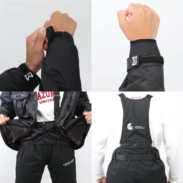 【オレンジブルー/ORANGE and BLUE】ディティールまで『釣りのための機能』に拘って開発しました。極寒、悪天候の中でも集中力を保ち、釣りをし続けるのに、防寒対策は必須です。優秀な防寒ウェアの着用は冬の釣果アップに必ず繋がります!NEWモデルはデザインを一新し、シンプルでシックな大人のデザインに!素材には防水、透湿素材『RAY-TEX』を使用し、裏地には毛足の短いフリースを採用。フリースの厚みを考慮して前モデルから身幅とアームホールをサイズ調整しました。ウエスト部には寒風の侵入を防ぎ防寒性を向上させるストームガード付き。さらに、鼻が隠れる高さに設定した襟、袖口はパンツのポケットを使用した二重袖構造によりウェア内で暖められた空気を外部に逃がさないので保温効果が飛躍的に高まります。パンツは高い保温性とズリ落ち防止を兼ね合わせたジャケットのポケット(サロペット部分は状況に合わせて取り外しが可能です)。シルエットはウインターブーツ着用時にもストレスのないブーツカットタイプです。必須機能の「フィッシングフィット」は当然採用し、キャスト、シャクリ、ロッドワーク等の釣りの基本動作がストレスフリーで行えます。各部位に取り入れた立体裁断は、ルアー交換やラインシステム、狭い船上での移動など、ショア、オフショアのあらゆるシチュエーション、ジャンルを想定しています。両サイドのポケットはパンツ、ジャケット共にマジックテープとファスナーの二重構造。貴重品の不意の落下を防ぎ、裏地は起毛素材になっているので手を入れておくだけでハンドウォーマーとしても機能します。mazumeの製品はアングラーにとっての『ユニフォーム』です。フィールドに立つアスリートがそうであるように、機能面だけでなく、着ているだけで気分が高揚し「今日は釣れる!!」と思わせてくれる製品でありたいと考えています。[mazume CORE ALL WEATHER SUIT]