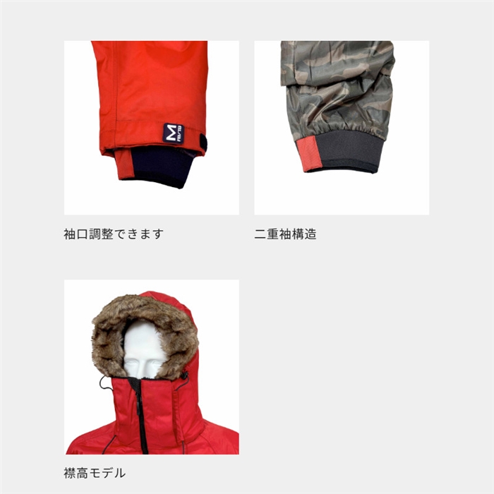 【オレンジブルー/ORANGE and BLUE】もちろん必須機能の「フィッシングフィット」を採用。ルアーアクション、キャスト精度を損なうことなく防寒性能と動きやすさを両立しています。袖口は伸縮性のあるネオプレーンを使用した二重袖構造。手首の太さに関わらず隙間を無くし、冷風の侵入を防ぎながら体温で暖められた空気を内部に留めます。鼻まで隠れる高さの襟は裏地がボア素材になっており、ファスナーを全て閉めるとネックウォーマーを付けているよう暖かさ!肌触りも抜群です。ブーツカットシルエットのパンツはウインターブーツ着用時でも綺麗なシルエットで見た目もスタイリッシュな仕上がりです。冬は魚の活性も下がり、アングラーにも過酷な状況が多いですが、メモリアルフィッシュとの遭遇率が高いのも事実。そのワンチャンスを逃さないためにも装備は完璧でありたい。コンタクトオールウェザースーツはウインタースポーツウエアや、アウトドアウエアとは設計段階から異なるフィッシング専用設計のウインターウェアです。[mazume CONTACT ALL WEATHER SUIT]