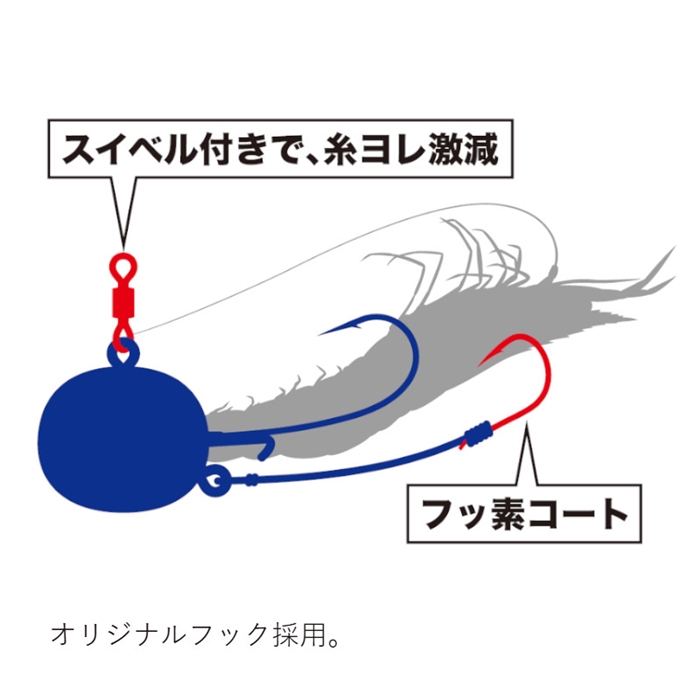 【メジャークラフト/MajorCraft】カドの無い滑らかなげんこつ型オリジナルヘッド形状により水の抵抗を受けにくく、素早く着底し、底取りしやすのが特徴です。手返しが良く、真鯛へのアピールチャンスに長けています。さらに日本製の孫針にはフッ素コートを施し、驚異の刺さりを実現します。