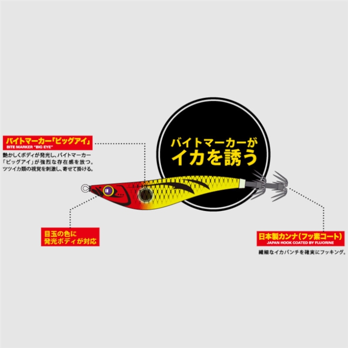 【メジャークラフト/MajorCraft】餌木博士こと薗田隆次氏デザインの大きなバイトマーカーを搭載した「ビッグアイ」シリーズ!その名の通りボディに大きく際立つ目玉、それが「ビッグアイ」なのです。ボディが艶めかしく発光し漁火を焚いて行う夜は「ビッグアイ」のシルエットがくっきりと浮かび上がります。イカメタル、オモリグで狙うツツイカ系のイカは捕食するターゲットの目玉に襲いかかる習性をもっているためビッグアイを目掛けてしっかり抱いてくれるのです。[BIG EYE スッテ]