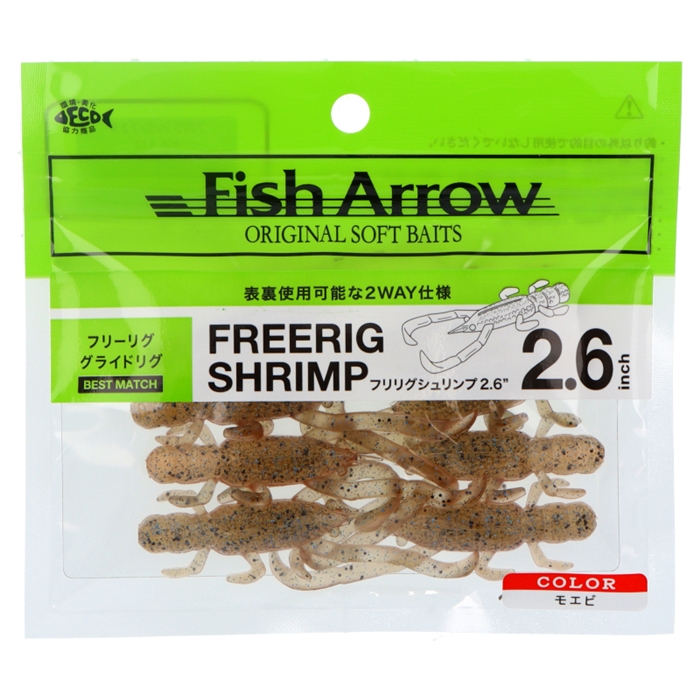 【フィッシュアロー/Fish Arrow】4本のレッグパーツ(脚)は、フォール時にしっかりと動きフォールスピードを抑制、フリーリグ時に意図的にシンカーとの距離を出す事が出来ます。また、フックの針先に近い部分が動く事でフッキング率もアップ。クローパーツ(爪)は、スローリトリーブやスローフォールでも動くので、ライトウエイトのグライドリグでもしっかりと水を捉えてビビッドにアピールします。針持ちの良いモチモチとしたワーム素材と裏表使える2WAY仕様のフリリグシュリンプは、消耗の激しいチニングにぴったりの手長エビ系ワームです。[FREERIG SHRIMP 2.6inch]