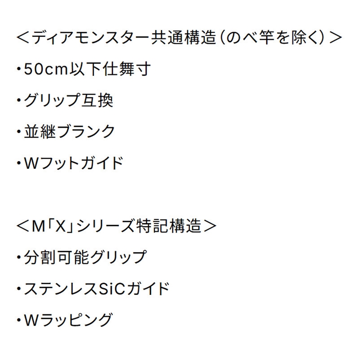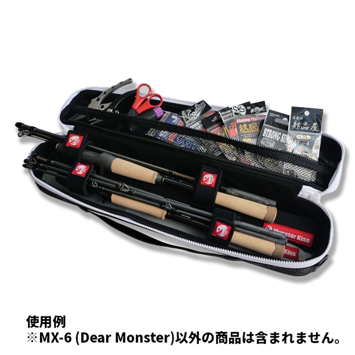 【モンスターキス/Monster Kiss】釣り旅に求められるロッドとは何か。モンスターキスの膨大な経験をフィードバックし、後に『怪魚ロッド』と呼ばれる新ジャンルを切り拓いたロッドが「MX-7」だ。仕舞寸50cm以下による優れた携行性は、前提に過ぎない。「並継ブランク」設計と「Wフットガイド」「Wラッピング」セッティングによる耐久性の追求は、60度強度試験で最大14kgリフトを記録し、『マルチピースロッド=弱い』という常識を覆した。かつてない「分割可能グリップ」構造と、こだわりの「グリップ互換」設計は、ディアモンスターの他モデルと組み合わせにより究極的な拡張性を実現する。ボートからもの釣りも、ショアからの釣りも、どちらにも対応可能なレングス設定は、ディアモンスターの『最初の1本』として揺るがない。すべては「MX-7」から始まった。ディアモンスターが提示した、バックパック1つで旅するスタイル。両手が自由になる気持ち良さを体験すれば、もう『それ以前』には戻れない。[ディアモンスター]
