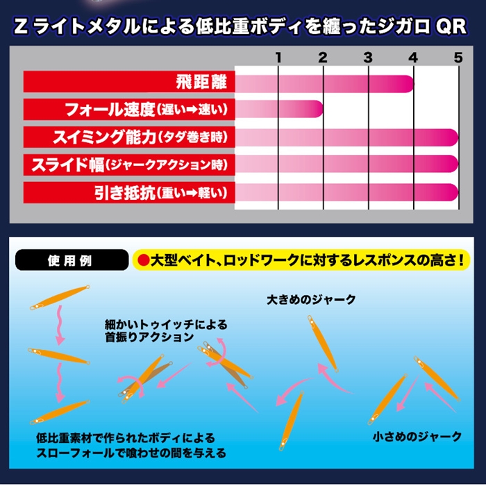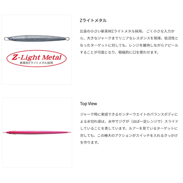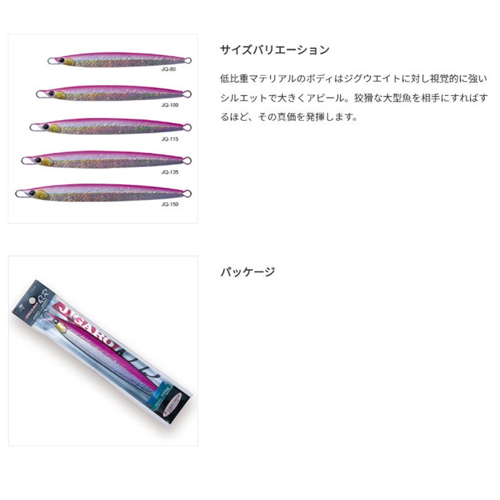 【パームス/PALMS】2018年Zライトメタルによる低比重ボディを纏ったジガロQRがファミリーに加わりました。飛距離のバランスとジガロアクションを追究したセンターウエイトバランスボディは、ロッドワークに対してシリーズ最高峰のアクションレスポンスを発揮します。意図的にシンクレートを落とすことで、金属ボディとは思えないスローフォールを実現。下方向へ向かう力が小さいことは、入力したパワーをすべて上、もしくは横方向へのアクションに変換できることを表します。低活性のターゲットにスイッチを入れ、視野内にジグを留めることを可能にするジグ。それはショアジギング、ジギングの世界に新たなタクティクスを提案します。[JIGARO QR]