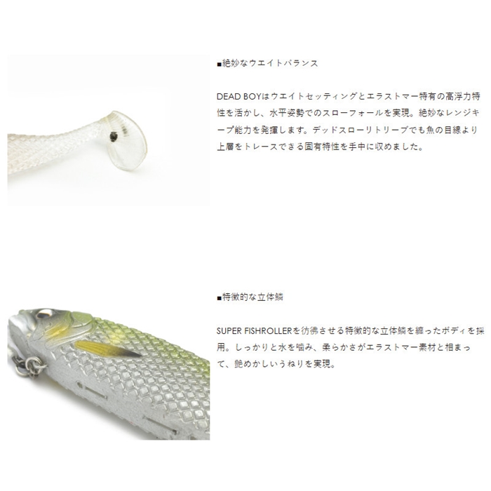 【レイドジャパン/RAID JAPAN】DEADBOYは、超低速リトリーブによって真価を発揮するデッドスローリトリーブ専用スイムベイトです。超低速域においてもしっかりとテーリングし、さらにテールが生み出した力をボディに伝達しヘッドシェイクに変換する超軟度エラストマー製ボディ。低水温期に突出した威力を発揮するデッドスロースイムベイティングにおいてもアドバンテージをもたらします。[26new16]