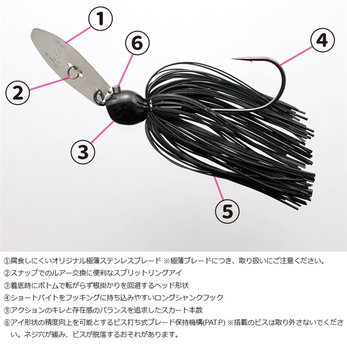 【一誠/issei】チャターベイトの強みは、強波動、強振動による『魚を呼ぶパワー』。AKチャターは『魚を呼ぶパワー』をより高めるべく、オリジナル極薄ロングブレードを搭載。効率よく水を掴むことで、ファストからスローリトリーブまで様々な速度域で釣れる振動をキープします。さらに、ブレードのポテンシャルを最大限に引き出すため、ヘッドとアイのバランスを最適化。ボディ全体をハイピッチに揺らすタイト千鳥アクションが魚を呼び、バイトに持ち込みます。安定感の高いヘッドはボトムでの転がりを減らし、着底時の根掛かりを回避。ウェイトに対して浮き上がりが良いため、ワンランク軽いチャターベイトと同じレンジをトレース可能です。ブレード保持機構には、ビス打ち式(PAT.P)を採用。従来のワイヤー曲げ込み式と比較し、アイ形状の精度向上が可能となったことで、AKチャター本来のポテンシャルを引き出すことに成功しました。
