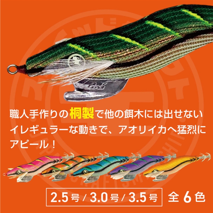 【スクイッドクラフト/SQUID CRAFT】34 家邊克己氏渾身の新ブランド『スクイッドクラフト』職人手作りの桐製で他の餌木には出せないイレギュラーな動きで、アオリイカに猛烈にアピール!特殊な形状のシンカーによりダートのキレを増やし少しのしゃくりで大きく動いてアピールします![チョウヤク サイセン アサギイロ]
