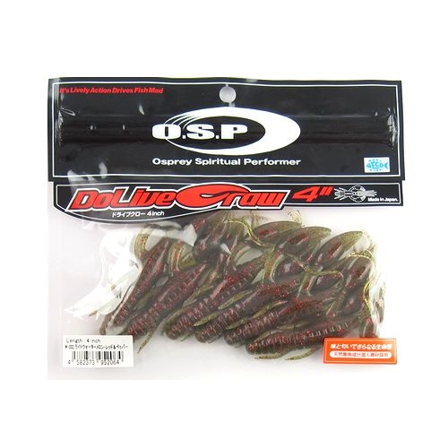 O.S.P初のワーム、『ドライブクロー』は、゛全てのパーツが無駄なく機能し、何時如何なる時でもバスを誘い続ける゛各パーツのそれぞれ異なった動きがMIXすることで生まれる別格の艶かしさはフォール中のバイトを激増させる。着底直後にはボディーに対してハサミとヒゲが遅れてスローに倒れ込む時間差アクションが発生してバスを魅了し、その後の様々なパターンの誘いでもパーツのどこかが常にバスを誘い生命感を失うことはない。まるで生きているかのような蠢き(うごめき)と疑いなき強烈なバイトを体感してほしい。