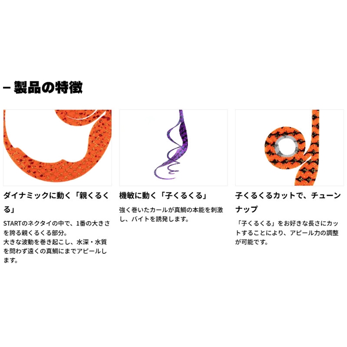 【スタート/START】2025年初っ端のSTARTの超注目新ネクタイ!その名も「マジくるカーリー」。ダイナミックに動く「親くるくる」と機敏に動く「子くるくる」が、それぞれ異なる波動を産み出し真鯛の興味を惹き付けます。[25new16]