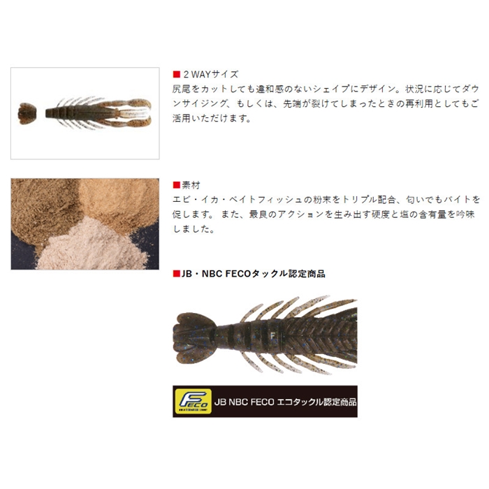 【ボトムアップ/Bottomup】本物のエビを投げ入れたようなリアリティ!スレバス相手であることが前提となった昨今のフィールド。ソフトベイトにおいても、強くアクションするタイプのベイトは警戒され、好反応を得られない場面が増えました。ハリーシュリンプは、バスの大好物であるエビの細やかな挙動をイミテート。ナチュラルな微振動アクションで用心深いバスをもスクープさせることなく、捕食本能を強烈に刺激します。[Hurry Shrimp]