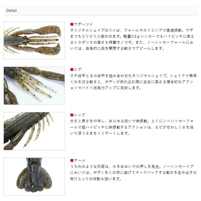 【ボトムアップ/Bottomup】本物のエビを投げ入れたようなリアリティ!スレバス相手であることが前提となった昨今のフィールド。ソフトベイトにおいても、強くアクションするタイプのベイトは警戒され、好反応を得られない場面が増えました。ハリーシュリンプは、バスの大好物であるエビの細やかな挙動をイミテート。ナチュラルな微振動アクションで用心深いバスをもスクープさせることなく、捕食本能を強烈に刺激します。[Hurry Shrimp]
