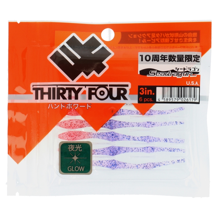 【34/THIRTY FOUR】34初となるハンドポワードワームです。最大の特徴は「しなやかさ」。柔らかさのなかに若干のハリがあります。背中に設けられた2つの山に潮が当たってテールが細かく動いて視覚的アピールしてくれます。今はプランクトンパターン全盛。動かさないことが基本になります。パフネーク同様、いかに動かさずにアピールするかを追求しました。港内の緩い潮流の中でも細かかくテールが動いてアピールし、アジが飛びついてくれます。ハンドポワードのしなやかさで簡単に折れ曲がるので小さなアジでも口の中に入りやすくなっています。アジは基本的に活性の高い魚です。実は活性の低いアジは産卵の時期ぐらいで、みなさんが「活性が低い」と感じるシチュエーションは単純にアジの数が少ないだけです。そうなってくるといかに少ない個体に「見つけてもらうか」が鍵になるわけです。そのため大きなワームを使うのが発見されやすくするという意味でも活躍してくれます。[Seadragon]