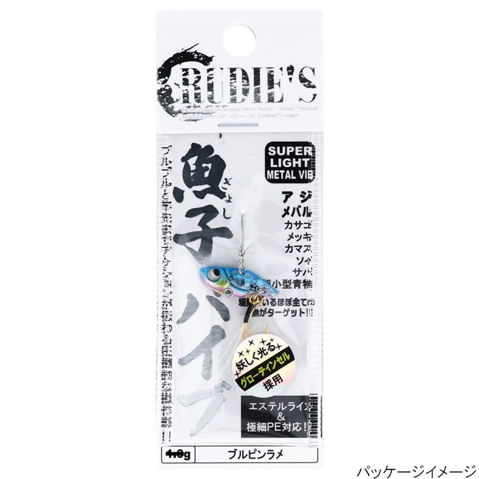 【RUDIE’S】アジ・メバルをメインとし、何でも釣れるのが特徴のマイクロメタルゲーム。しかし、軽量ウエイトの為、使用感が薄いという点が従来の課題であった。これをクリアーすべく誕生したのが「魚子バイブ」である。圧倒的な使用感と強波動による集魚効果は絶大!!究極のライトアイテムだといえる。[ぎょしバイブ]