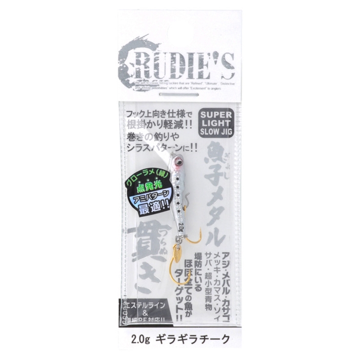 【RUDIE’S】フック上向き構造でメタルジグの釣りにおいてネックであった「根掛かり」を大幅軽減!これまで恐れていたボトムレンジを大胆に攻略することができます。超マイクロブレード・ちらしグローラメなど、あらゆるフィッシュイーターに効くアピール力抜群のマイクロメタルです。