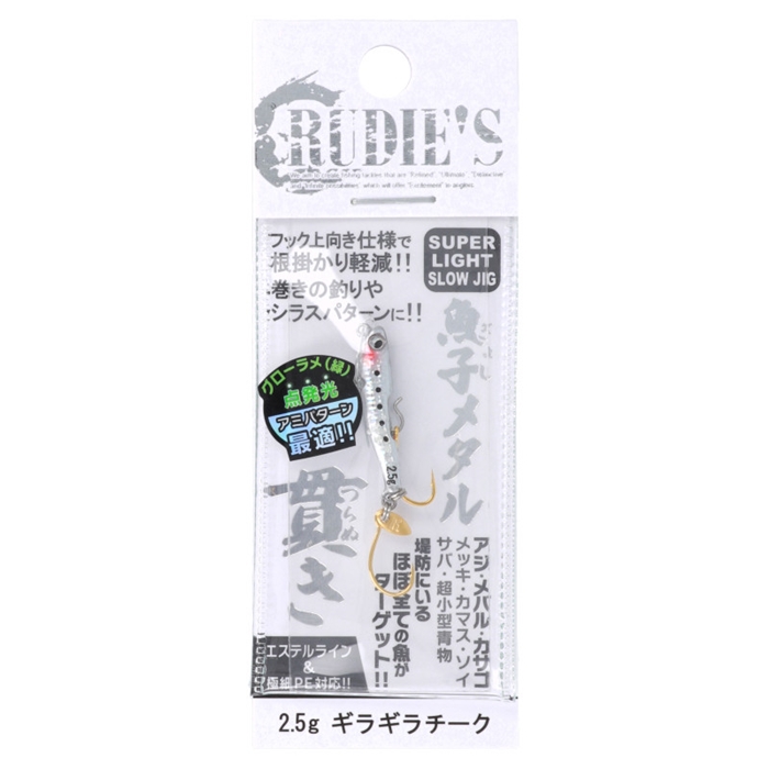 【RUDIE’S】フック上向き構造でメタルジグの釣りにおいてネックであった「根掛かり」を大幅軽減!これまで恐れていたボトムレンジを大胆に攻略することができます。超マイクロブレード・ちらしグローラメなど、あらゆるフィッシュイーターに効くアピール力抜群のマイクロメタルです。