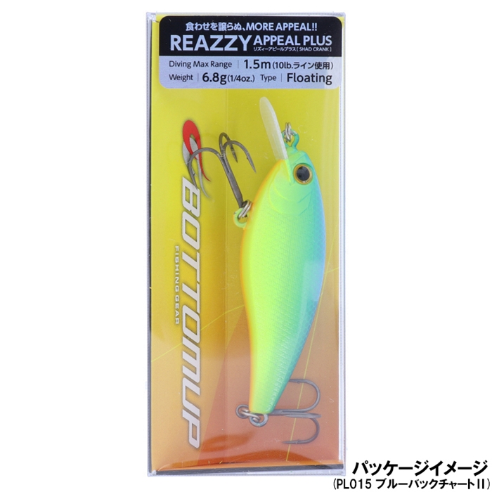 【ボトムアップ/Bottomup】食わせを譲らぬ、MORE APPEAL!!『リアルな目まぐるしさ』をコンセプトに、セレクティブなバスに口を使わせるシャッドクランク、「リズィー」。タフな状況下でこそ威力を発揮するオリジナル譲りの性能は継承しつつ、『浮力』・『アクション』・『サウンド』、それぞれのパワーを少しずつ引き上げたのが「リズィーアピールプラス」です。オリジナルとの違いは、ボディマテリアルにボーン素材を採用し浮力とウォブリング幅が微増。さらに比重の高い小径タングステンウエイトを内蔵することで、心地よいラトルサウンドを発生させます。それぞれは僅かな違いながら三位一体となり、さらにバスを惹きつける、タフコンディション前提のアピールチューンモデルです。[REAZZY APPEAL PLUS]
