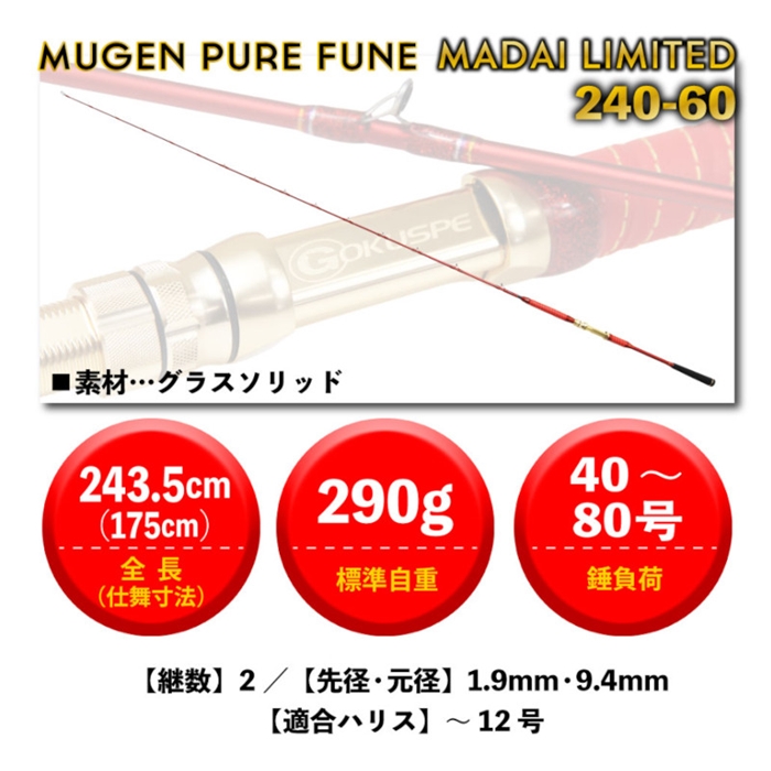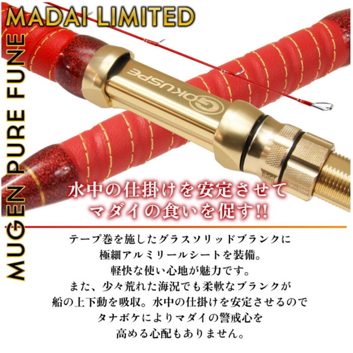 【ピュアテック/PureTec】ゴクスペ伝統のムーチング調コマセマダイロッドが「無限ピュア船 真鯛リミテッド」として復活。胴付近から曲がる独特のしなやかさと、溢れるトルク感を発揮するグラスソリッドブランクが最大の特徴。そこにテープ巻を施し、極細アルミリールシートを装備。軽快な使い心地が満喫でき、マダイの引きを存分に楽しめる1本です。実釣性能としてはグラスソリッドがウネリを吸収して水中の仕掛けが安定。持ち前の柔軟性で警戒心の強いマダイに口を使わせます。また、コマセが振りやすく、やり取りにおいても高い操作性を実現する軽量なバットを採用。さらに、その高い汎用性により青物などにも対応可能です。[Gokuspe MUGEN PURE FUNE MADAI Limited]